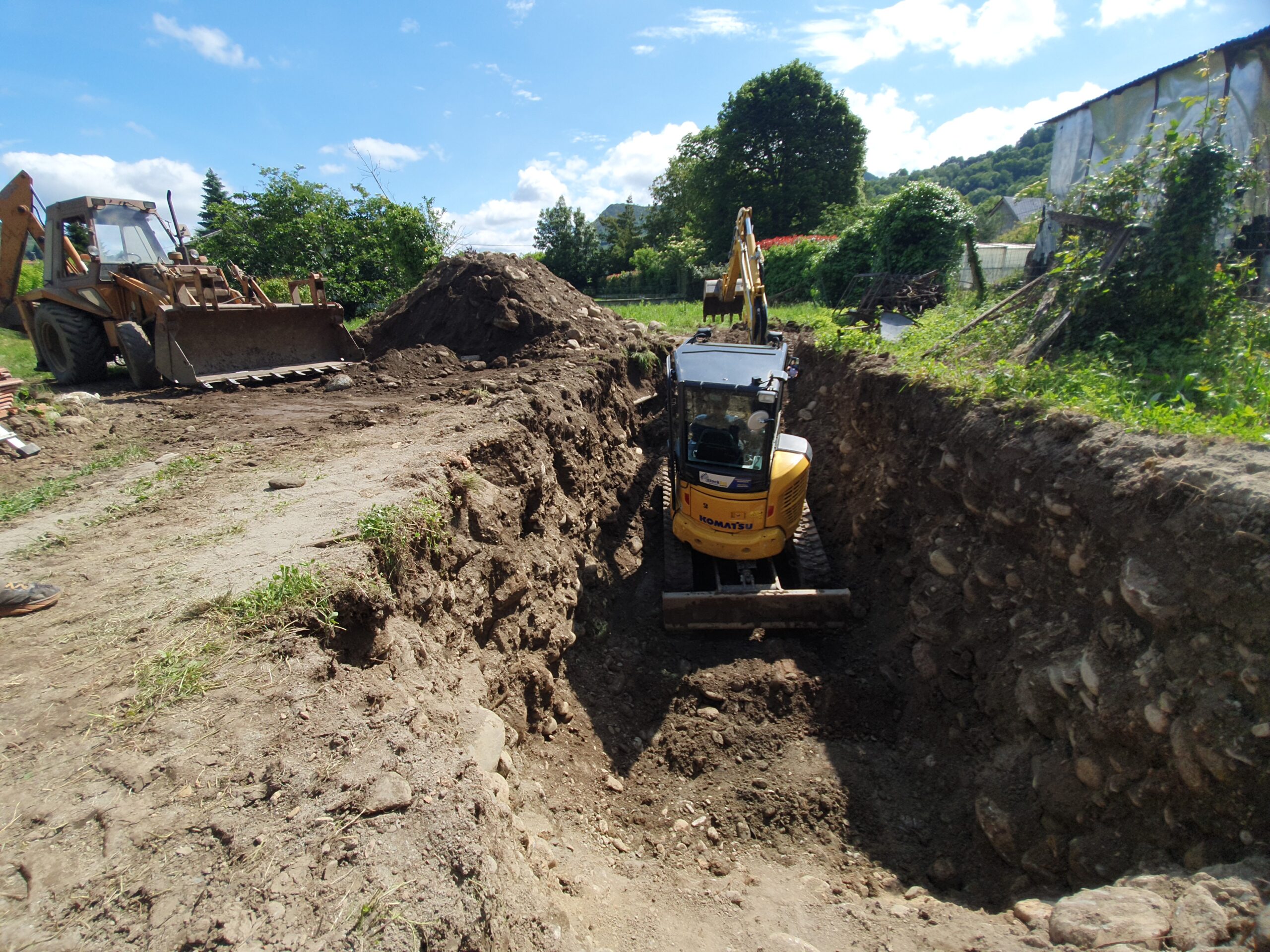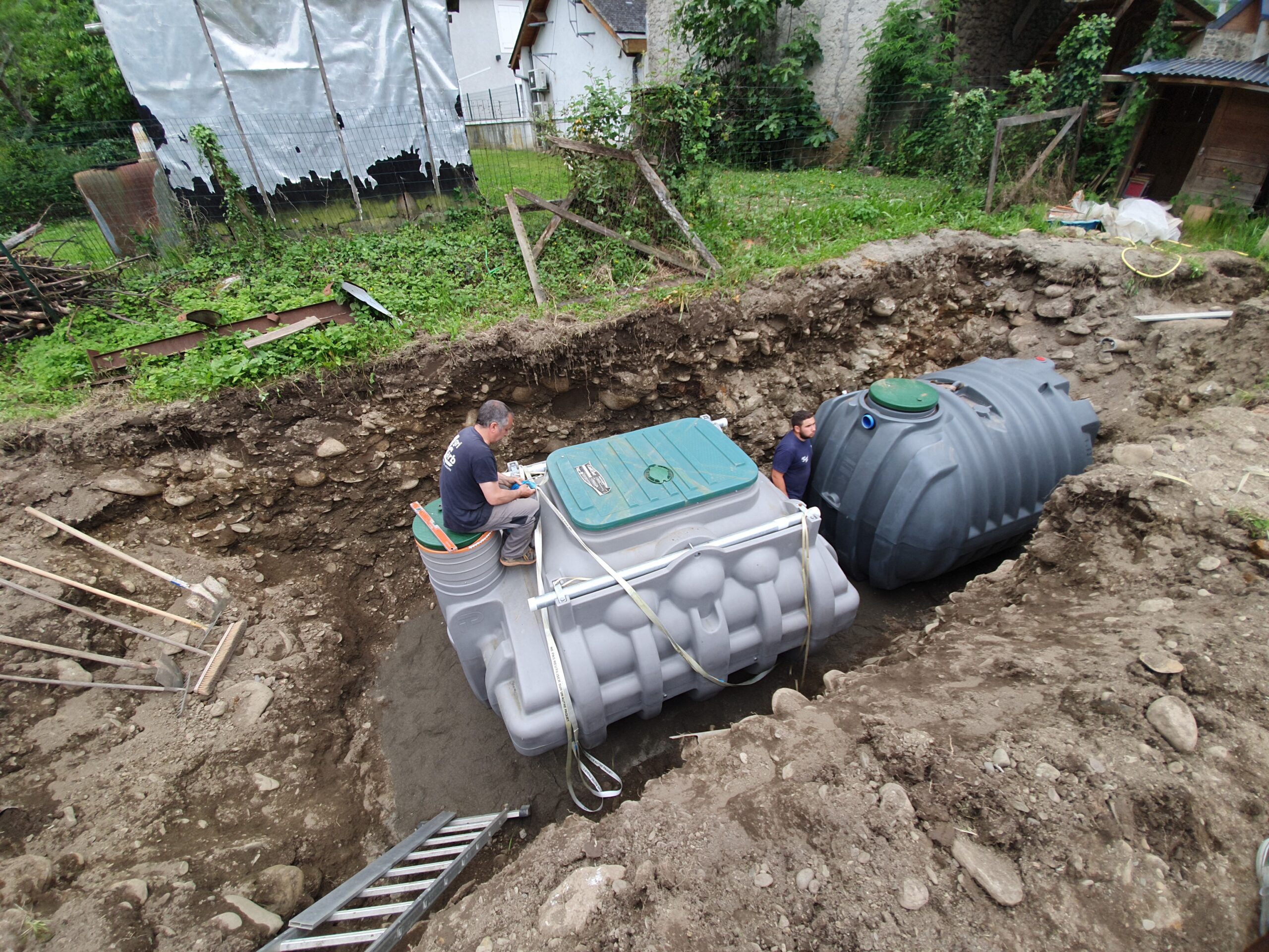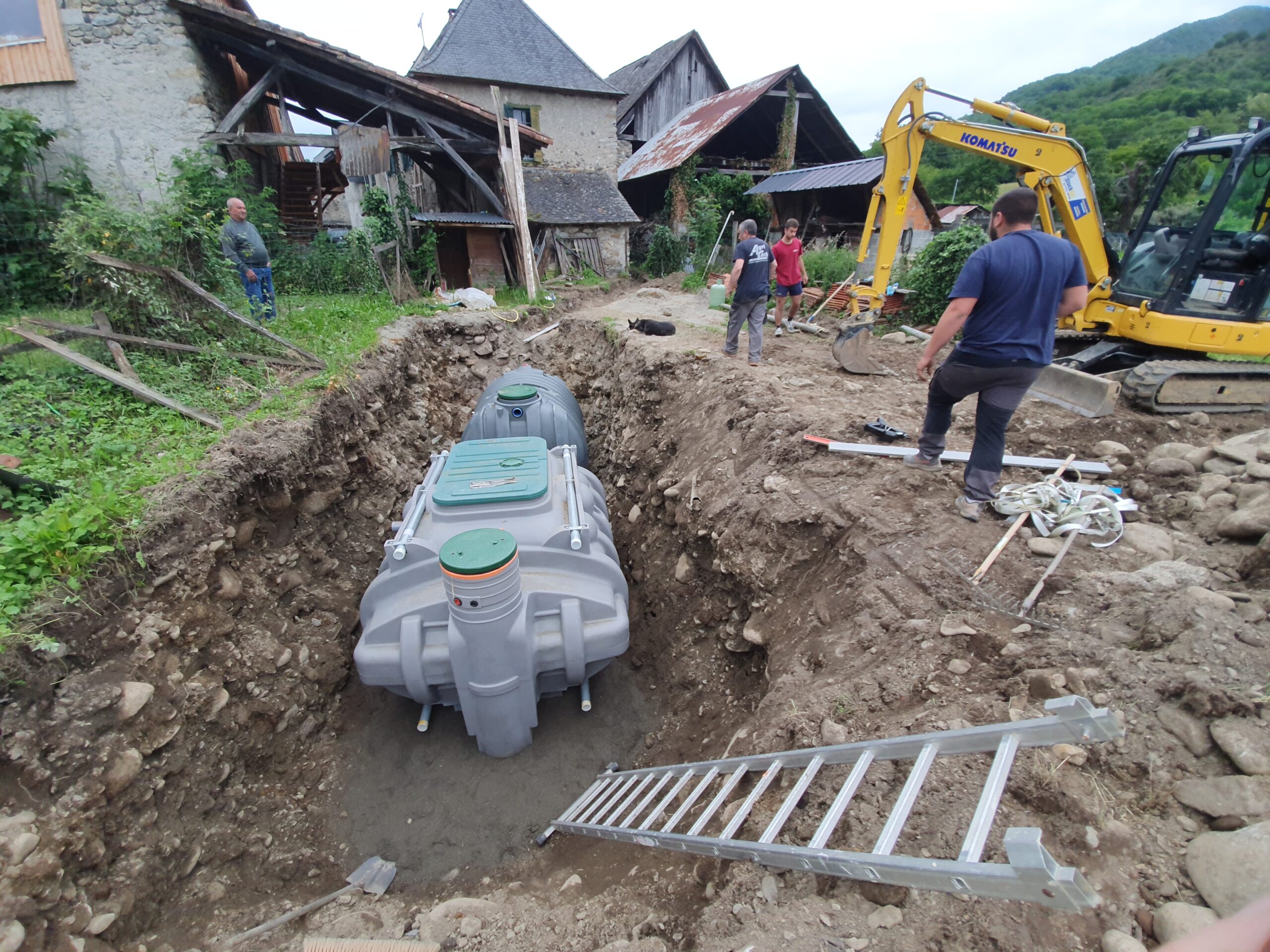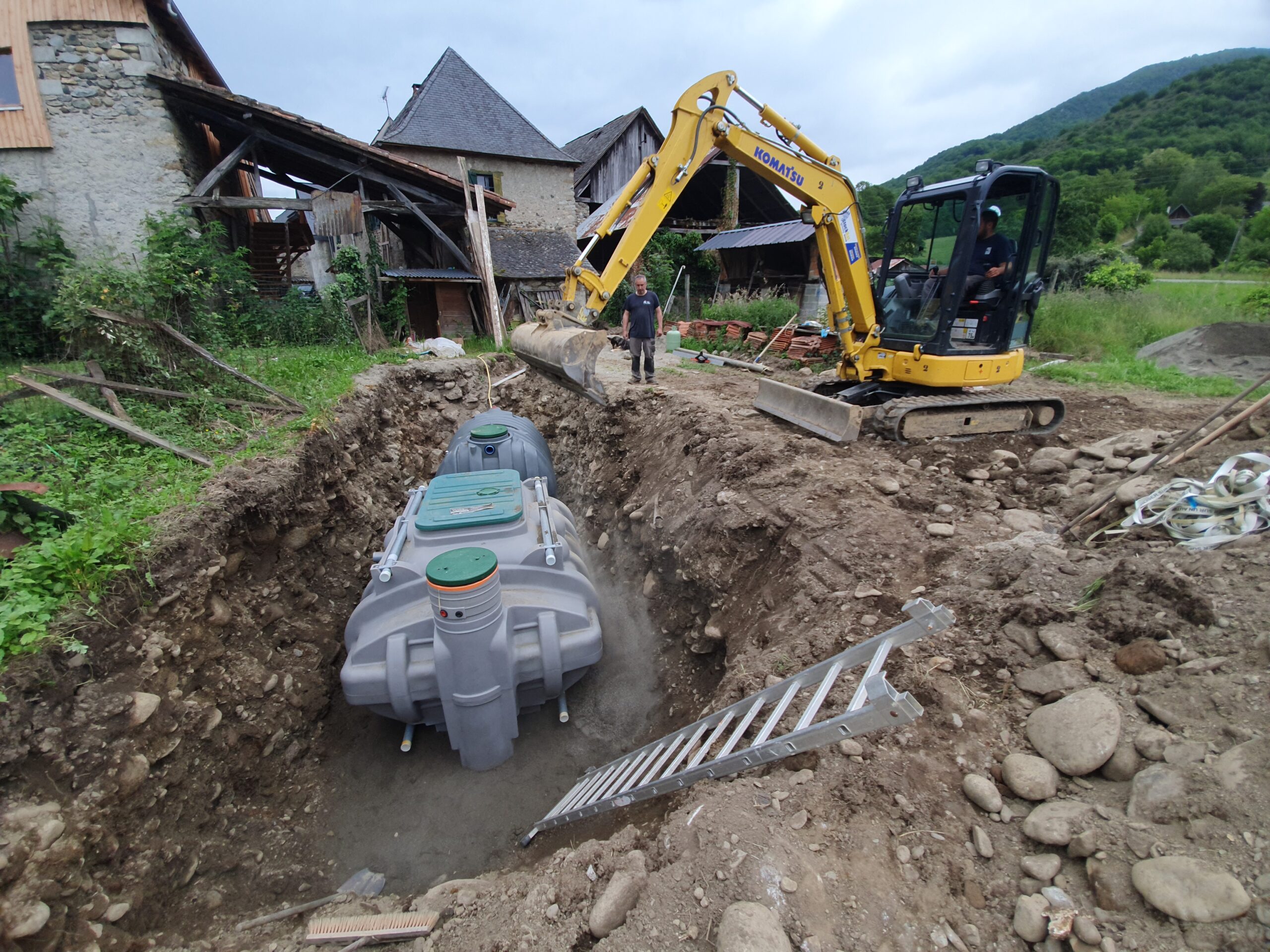 Décaissement du terrain et installation de la fosse septique et du filtre compact