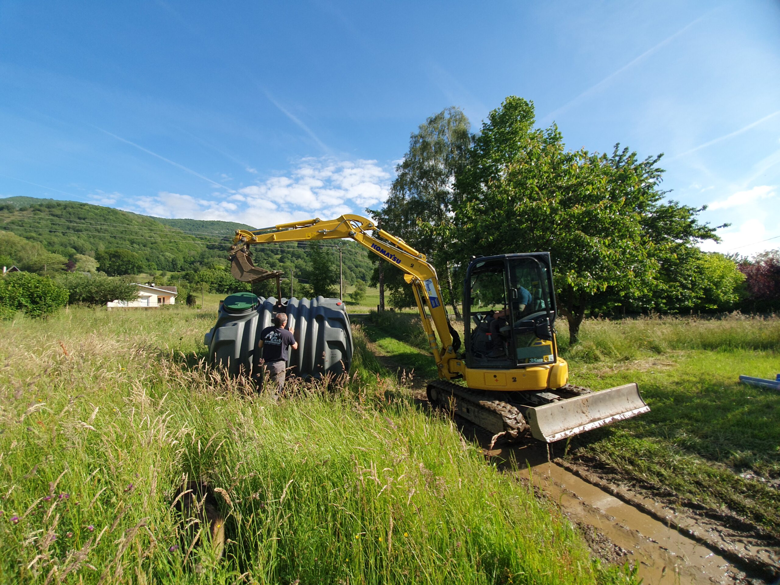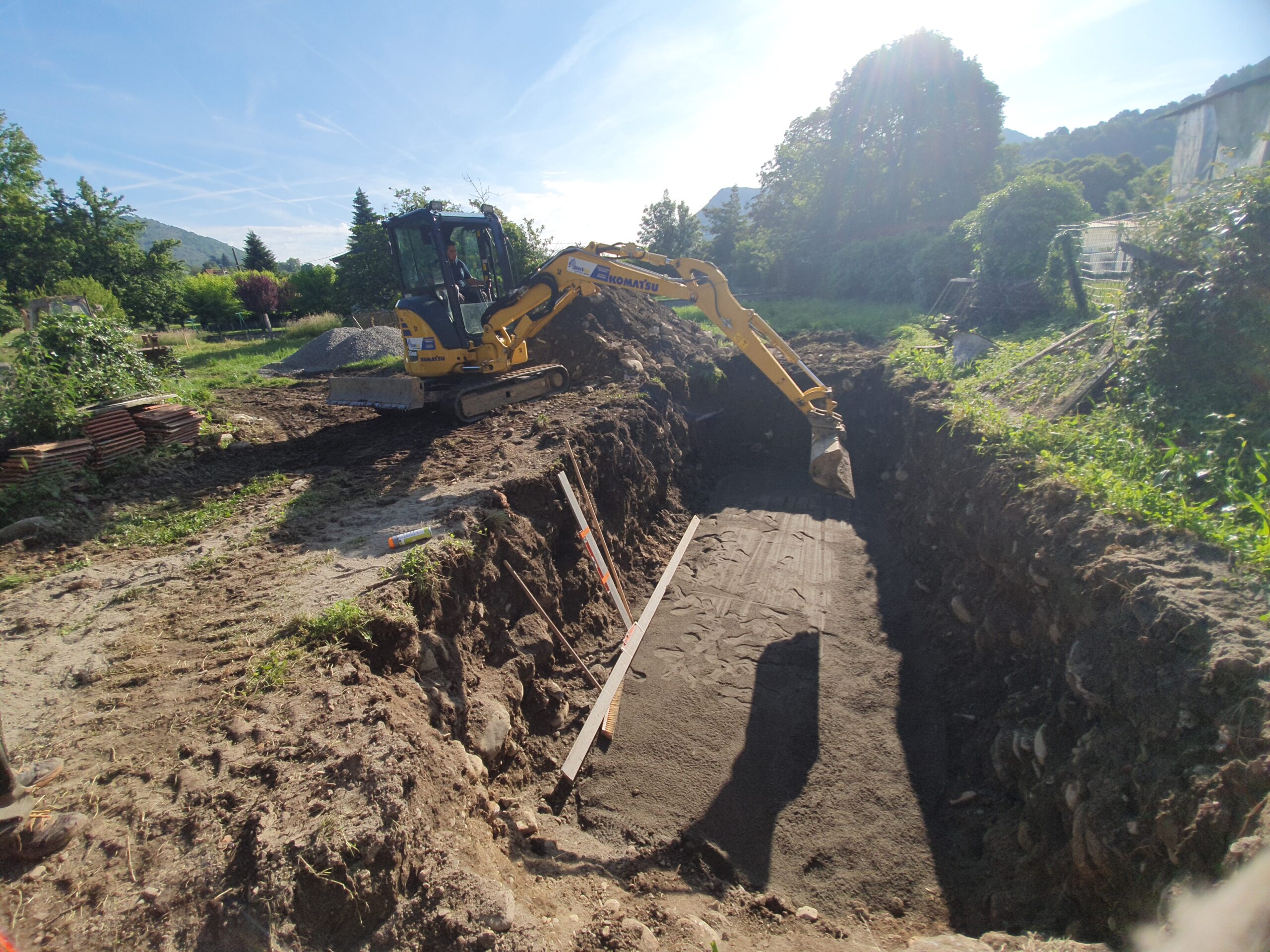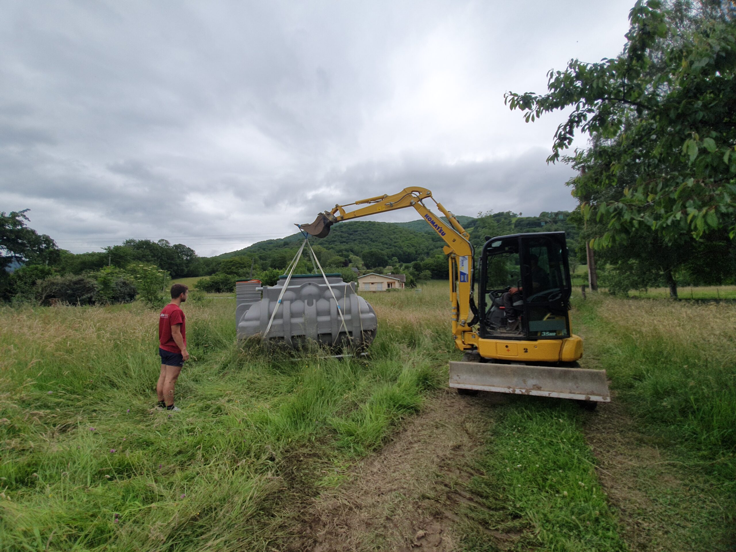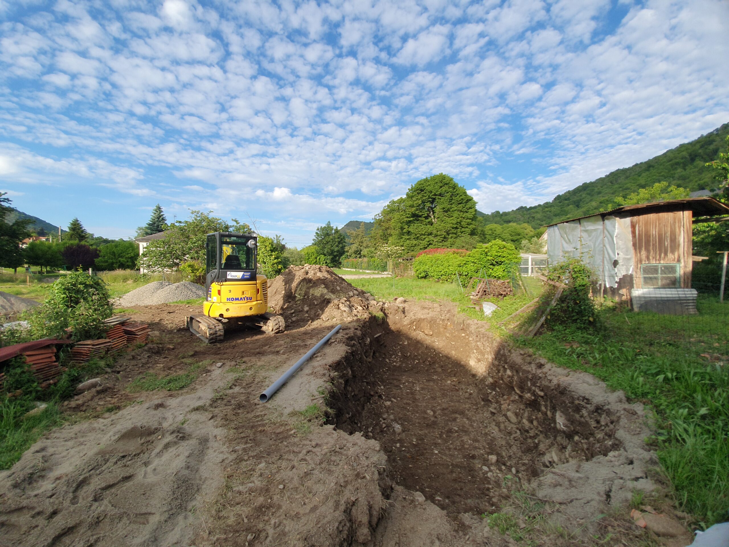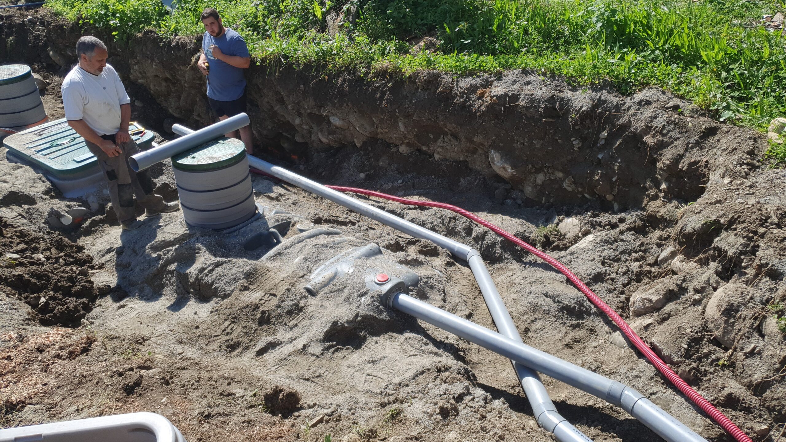 Décaissement du terrain et installation de la fosse septique et du filtre compact